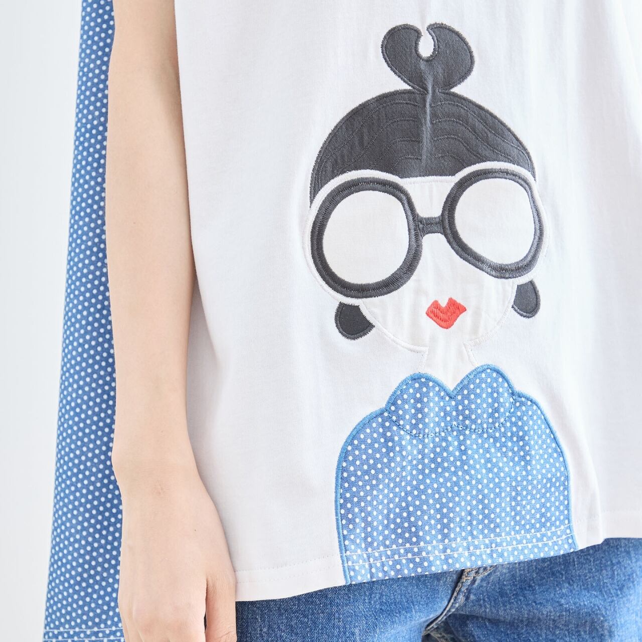 [新作]メガネガールプリントTシャツ 切替 ゆったりシルエット 半袖 ラウンドネック 花柄 ドット柄 ホワイト M L
