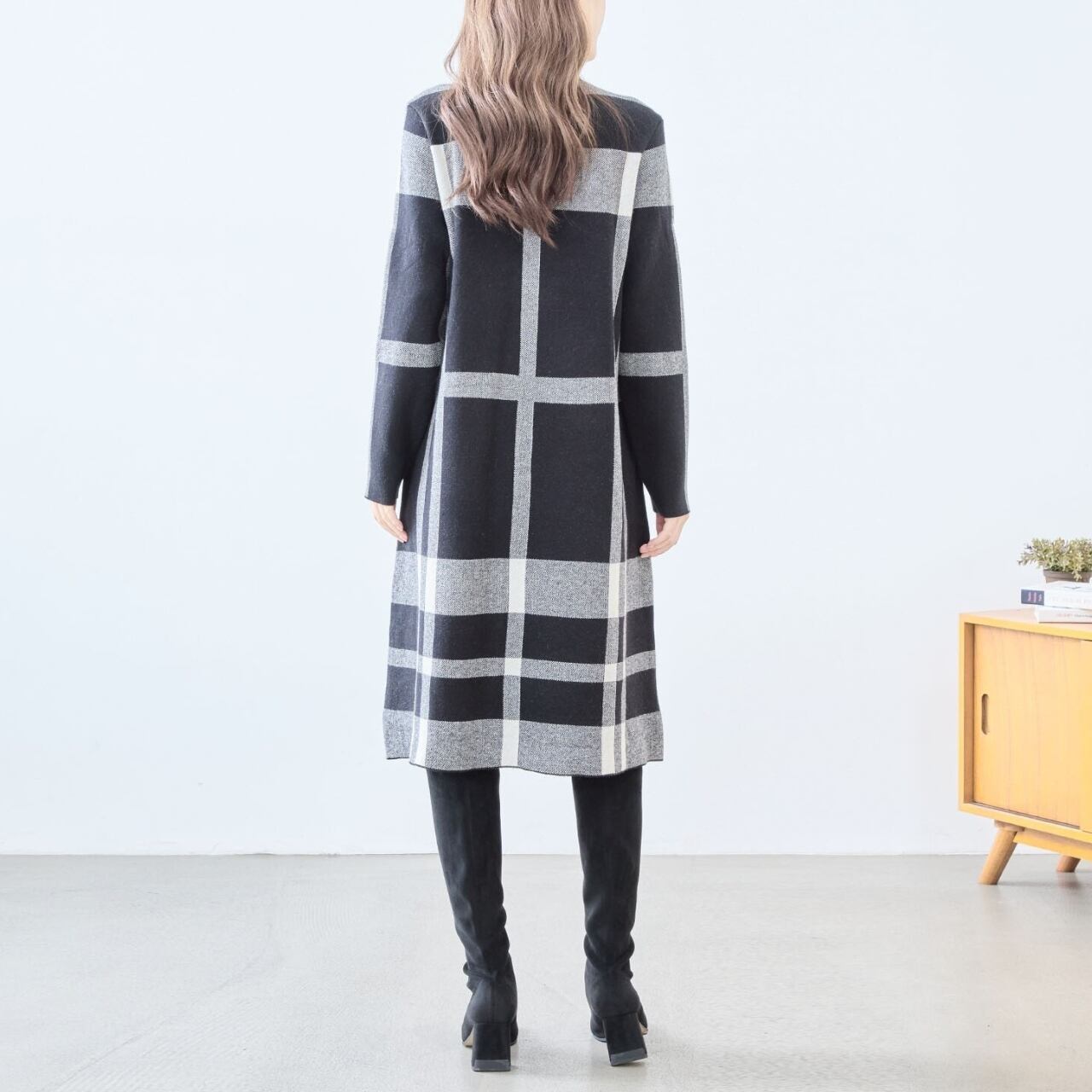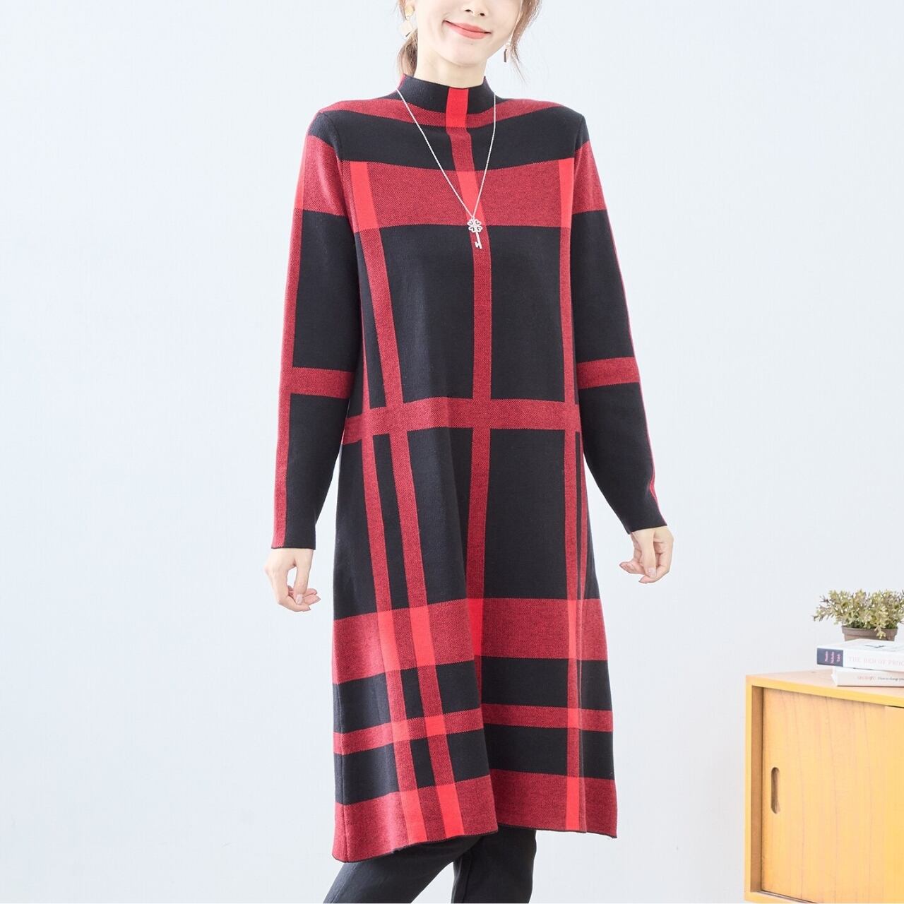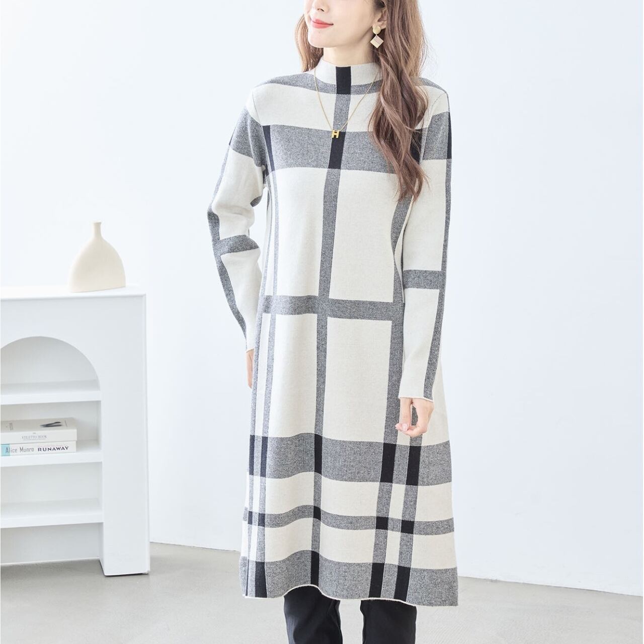 [新作][TRUBE]モックネックチェック柄ニットワンピース ひざ丈 長袖 小顔効果 チュニック ミセスファッション ブラック レッド ホワイト M L