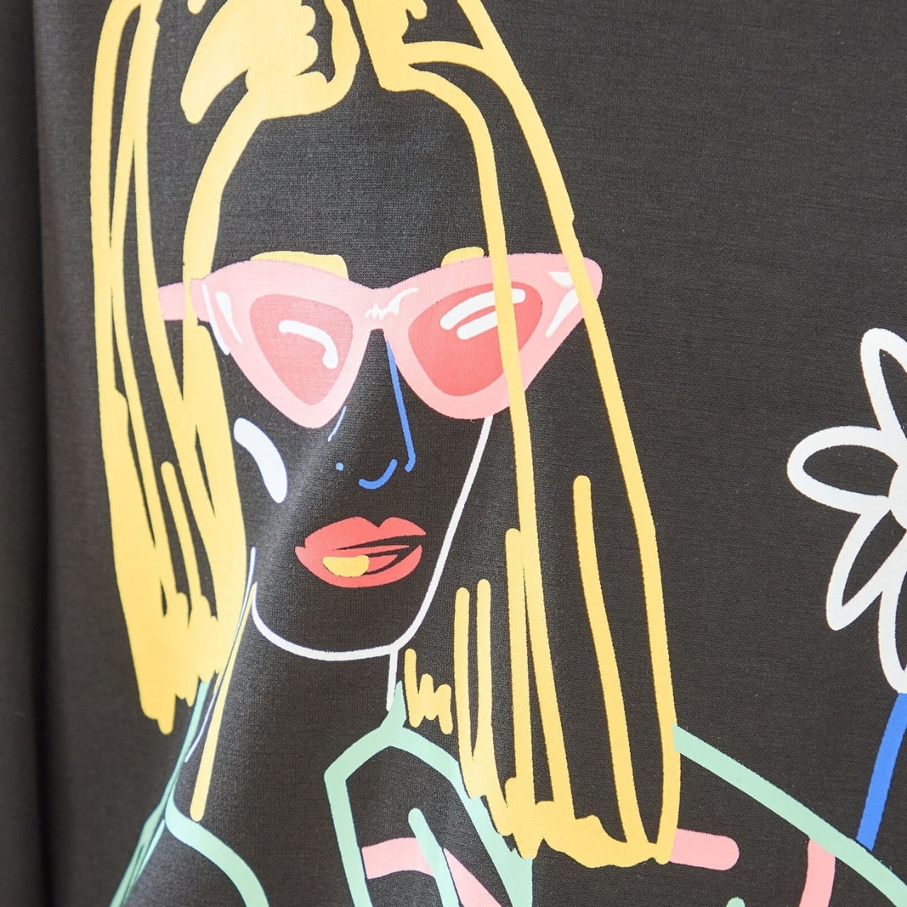 [新作][TRUBE]アートフェイスグラフィックロングTシャツ 長袖 ラウンドネック ミセスファッション 大人カジュアル ブラック カーキ グレー M L
