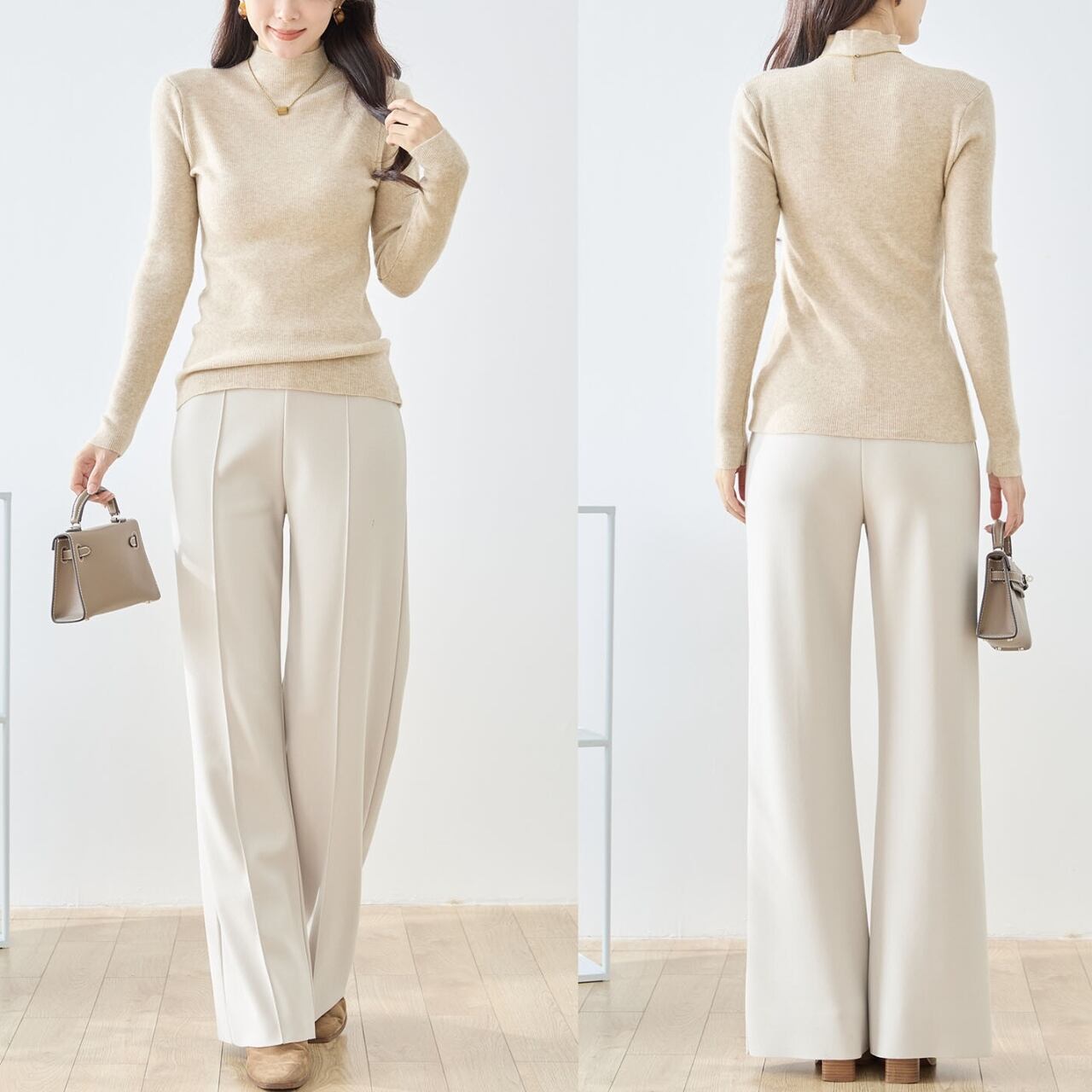高さを抑えたハイネックが首元をすっきり見せ