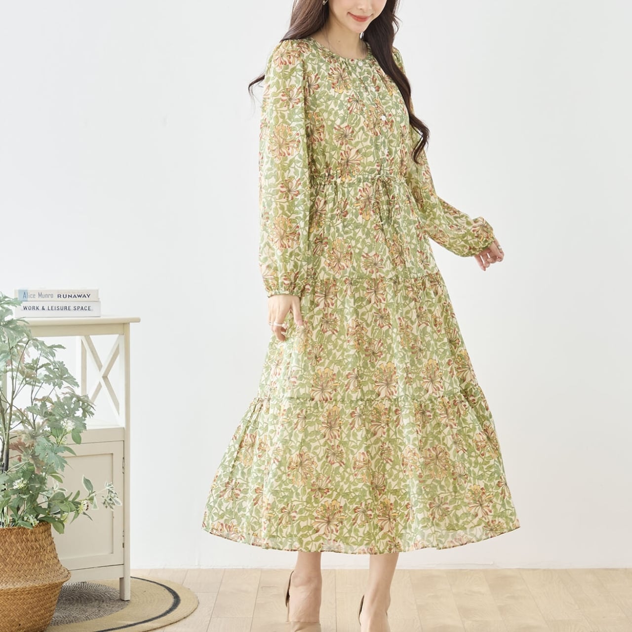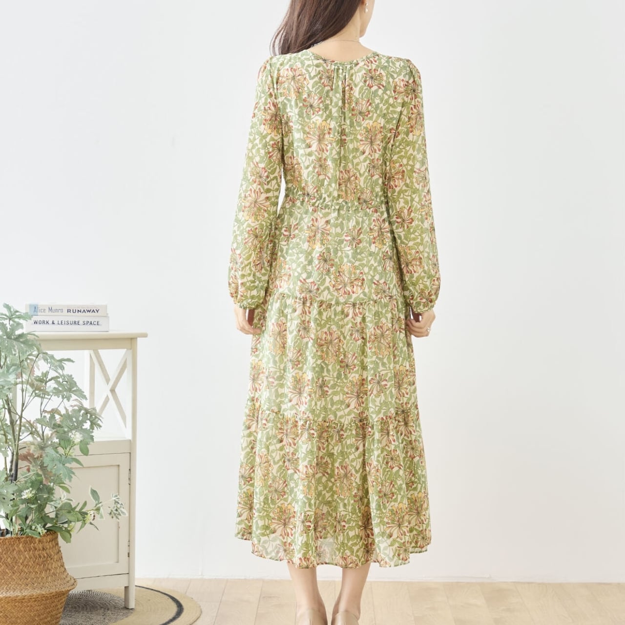 [新作][TRUBE]フローラルティアードワンピース ロング ボタニカル 花柄 長袖 ミセスファッション グリーン M L
