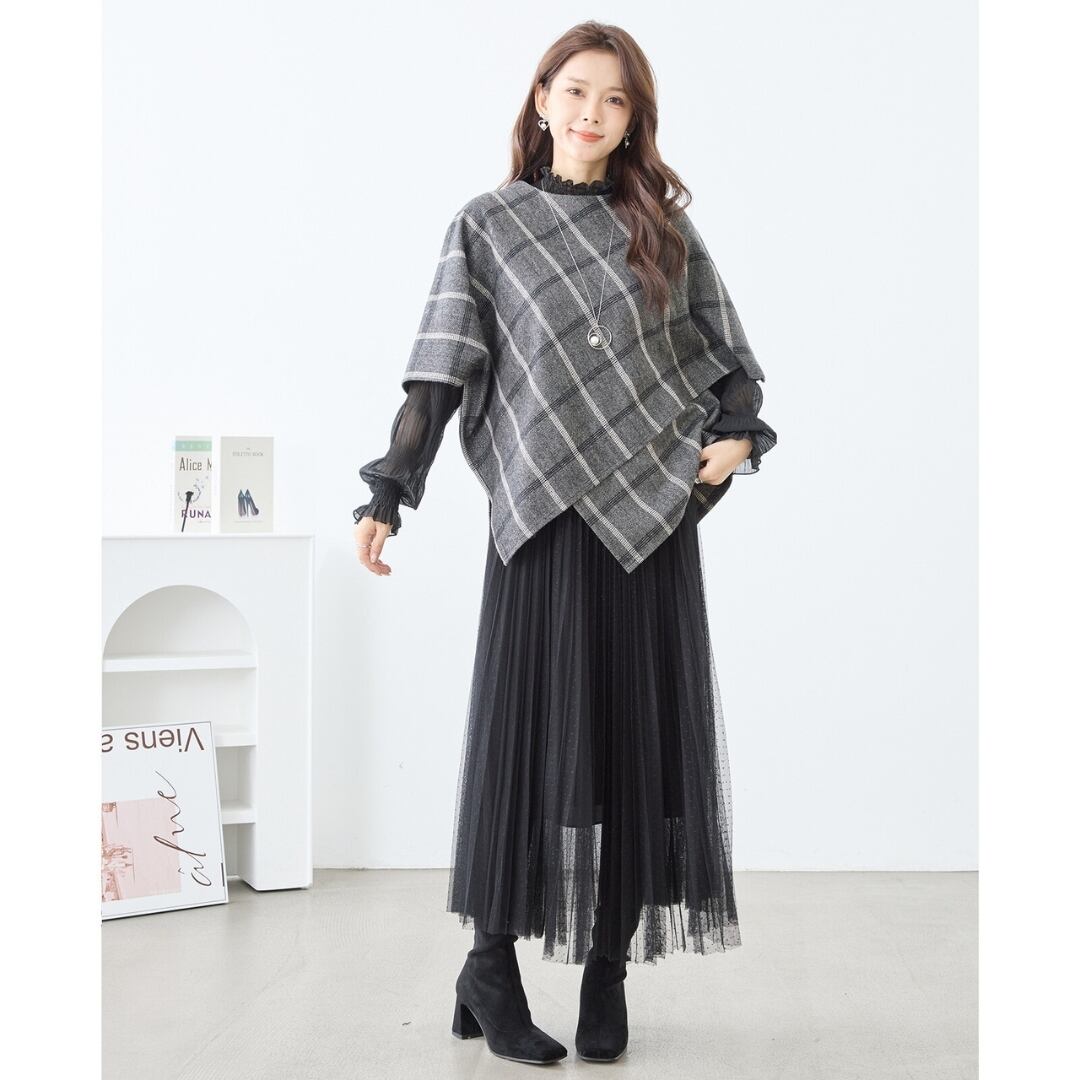 [新作][TRUBE]バイヤスチェックポンチョ ダイアゴナルチェック アウター 上着 ラウンドネック ミセスファッション(チャコールグレー)