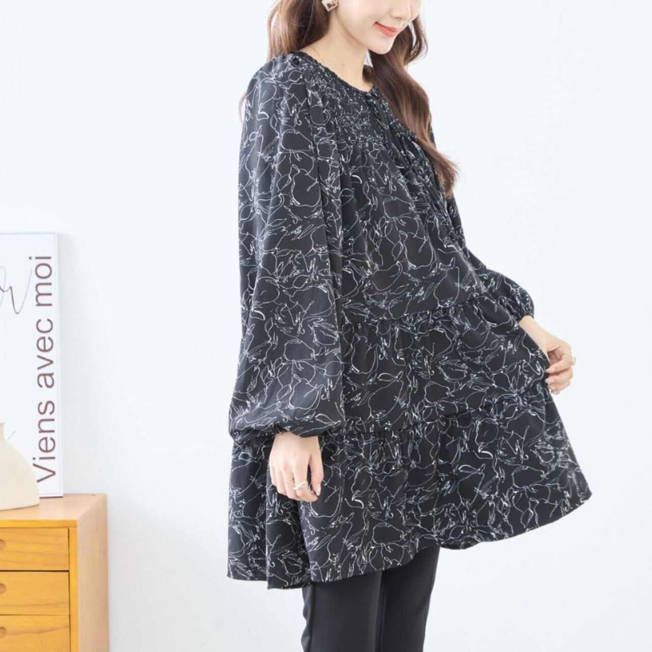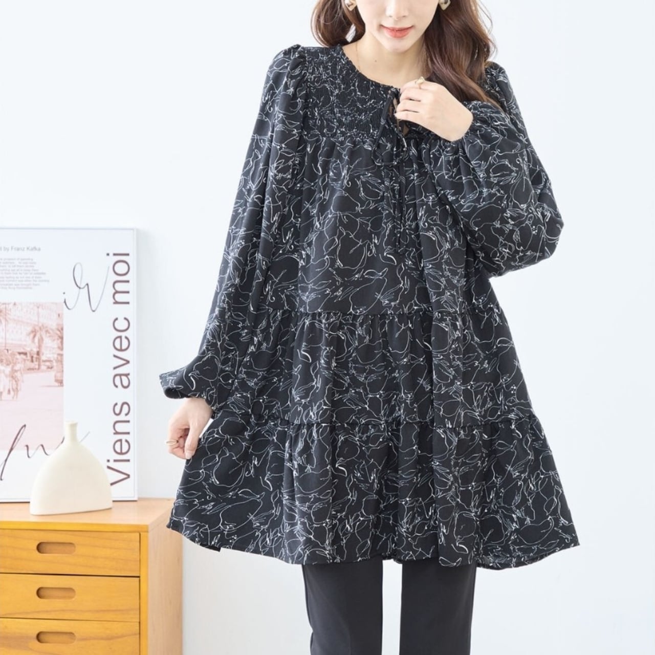 [amie studio]線画Aラインデザインチュニック ワンピース カットソー 襟なし 長袖 ラウンドネック ミセスファッション ブラック M L