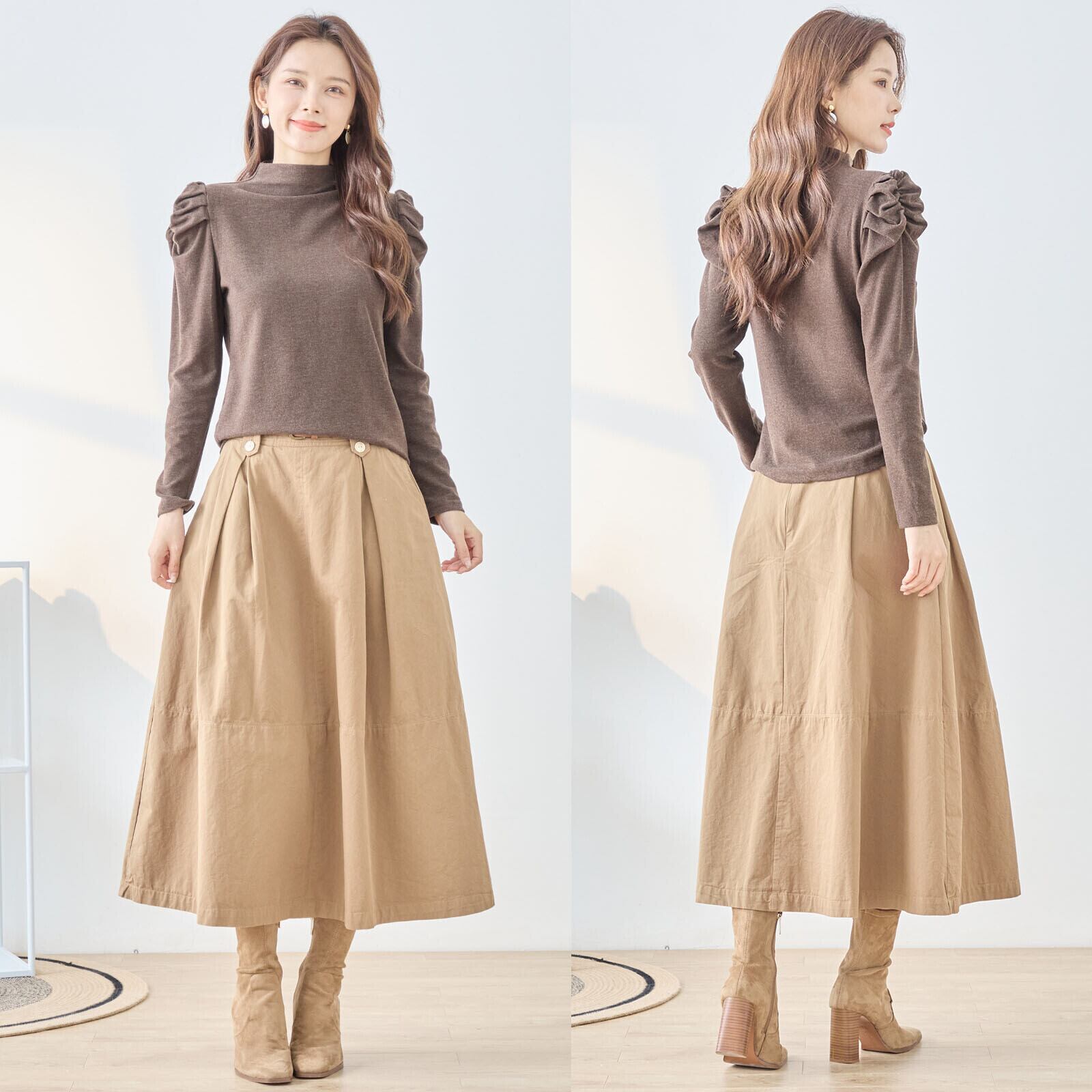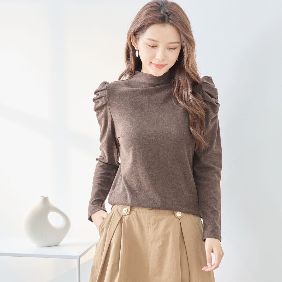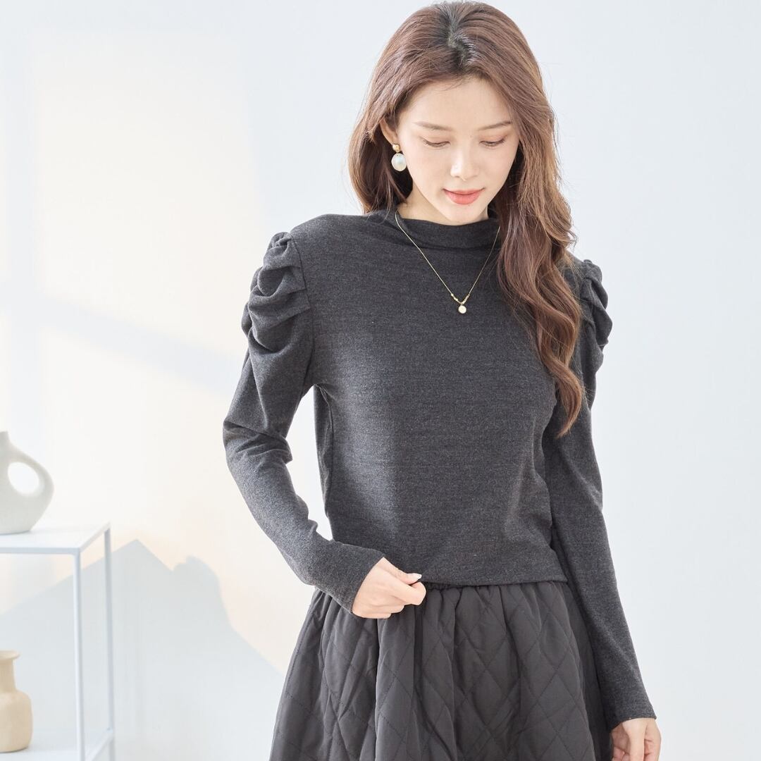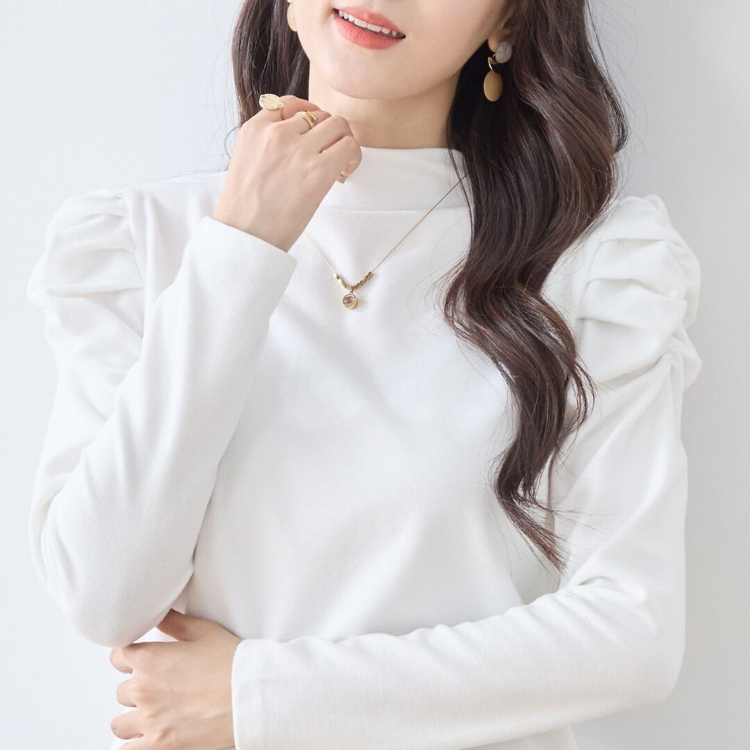 ハイネックとギャザーが施された袖が