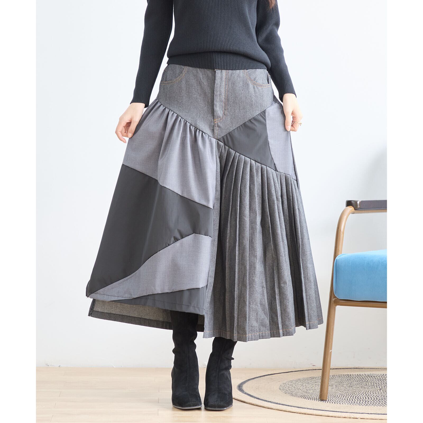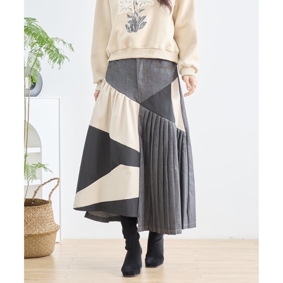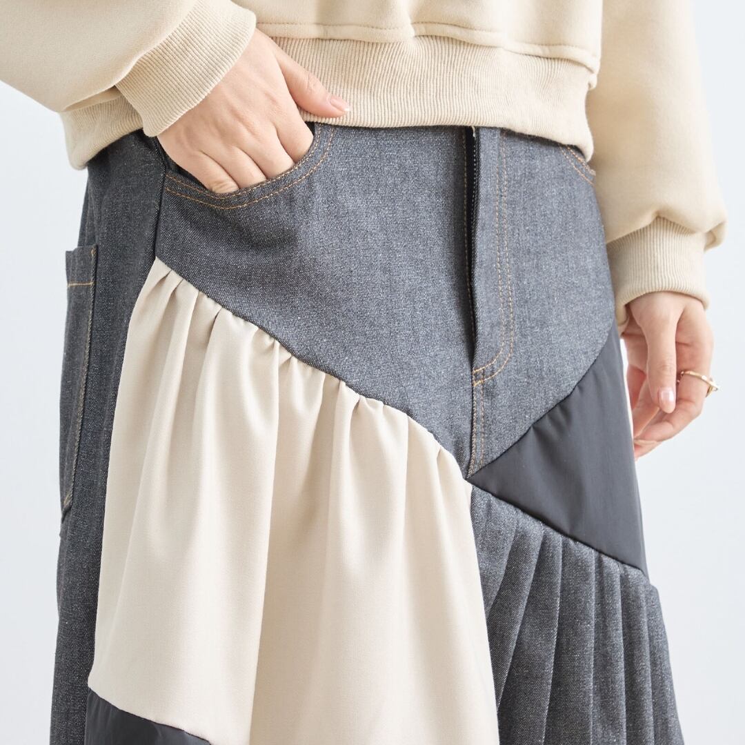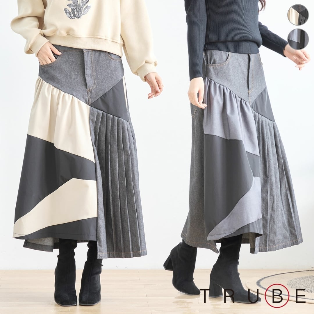 [新作][TRUBE]異素材プリーツデザインスカート ロングスカート デニムスカート ギャザー カジュアル Aライン 全2色