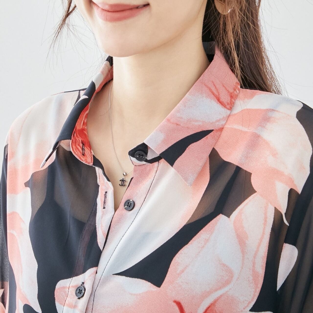 [新作][TRUBE]シフォン花柄ロングブラウス ロングシャツ 長袖 透け感 大きいサイズ リゾート ミセスファッション ブラック