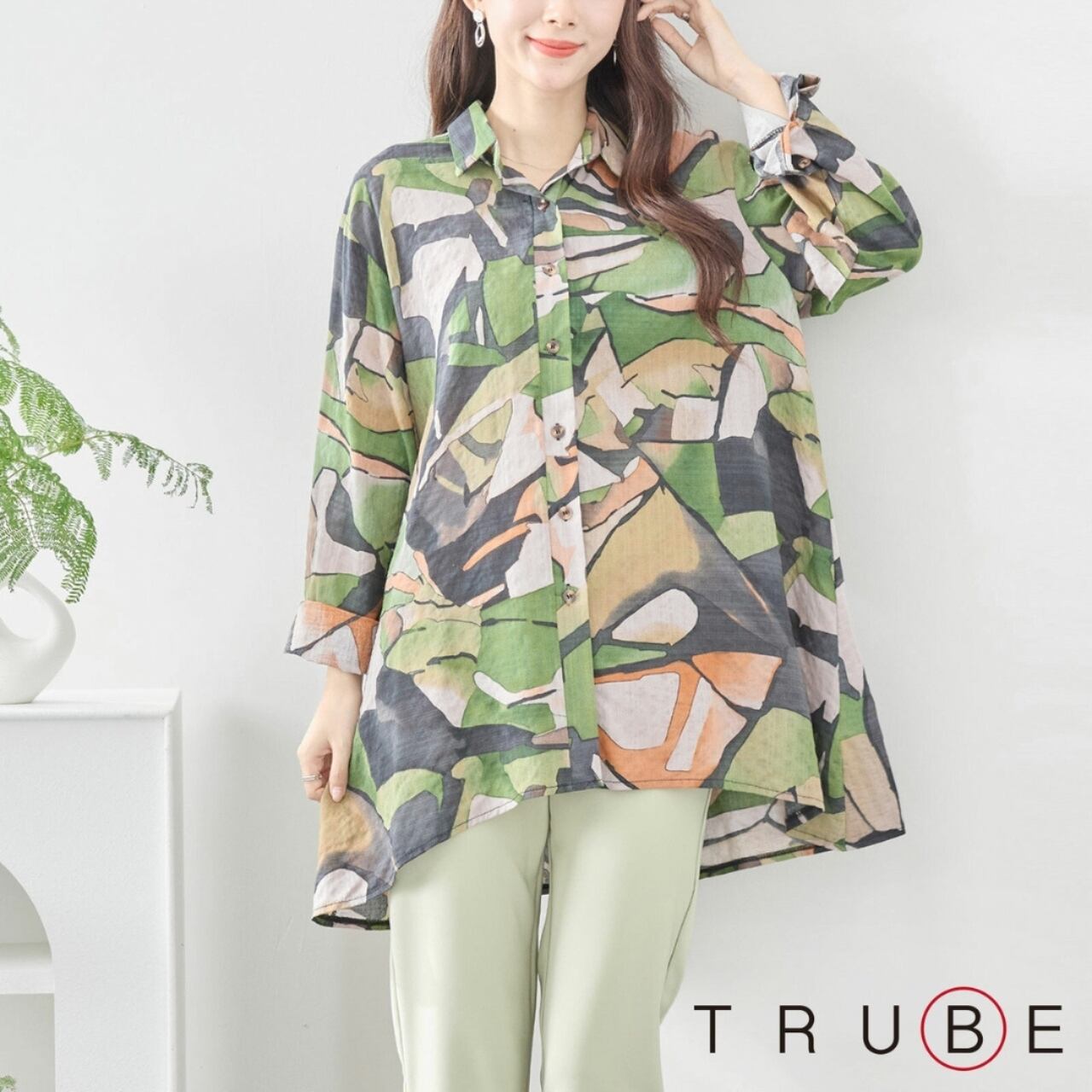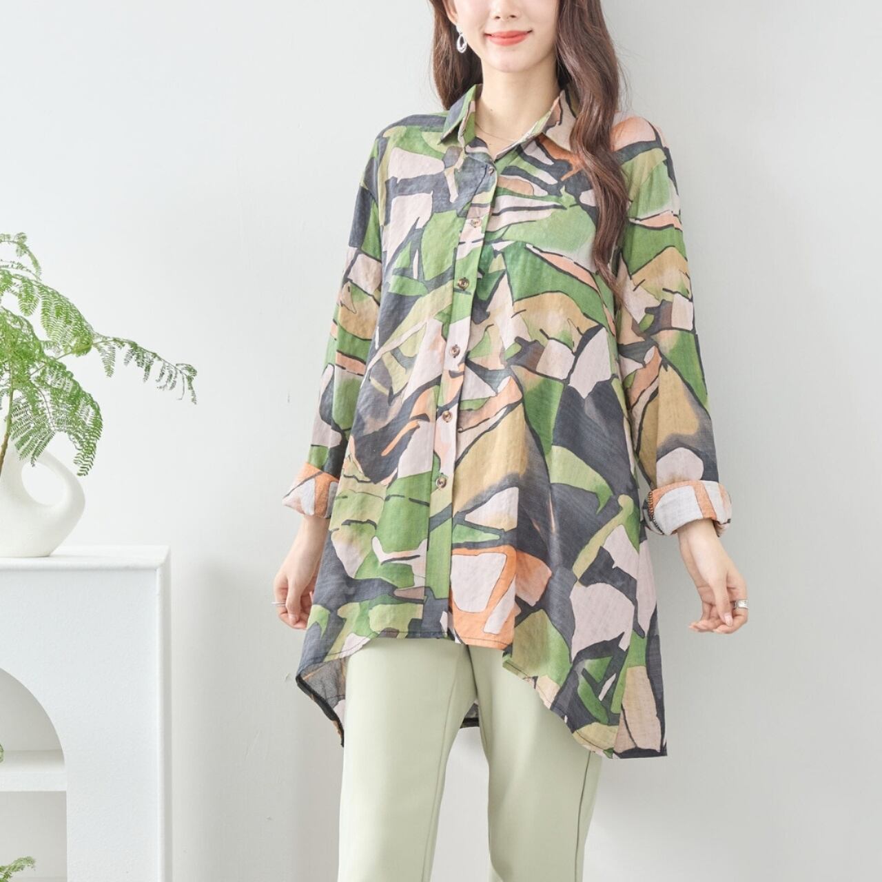 [TRUBE]コットンプリントワイドシルエットシャツ 長袖シャツ 幾何学模様 襟付き 春夏 グリーン