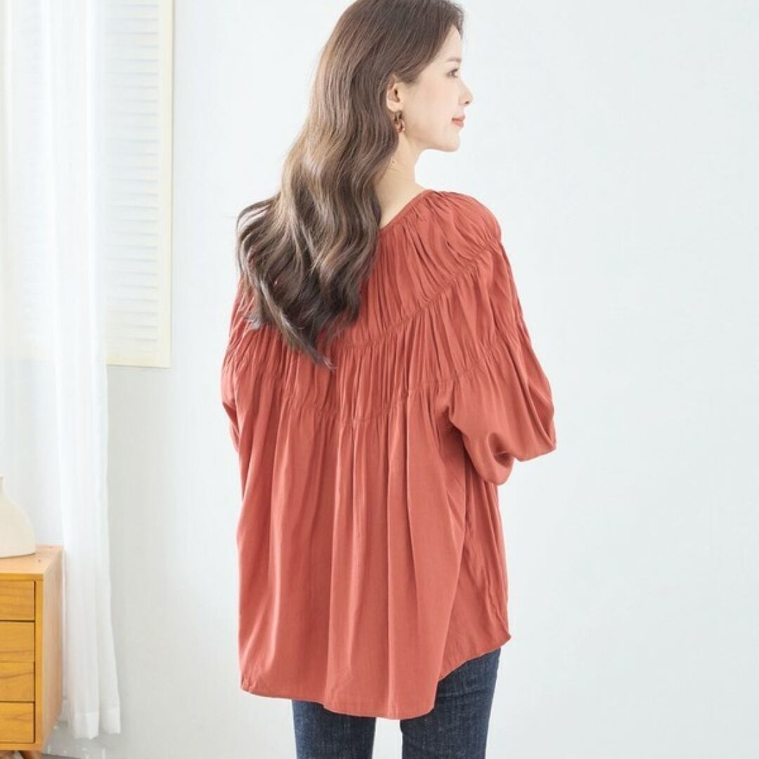 [reve bleu]ワッシャーギャザーブラウス 長袖 カットソー ラウンドネック 全2色