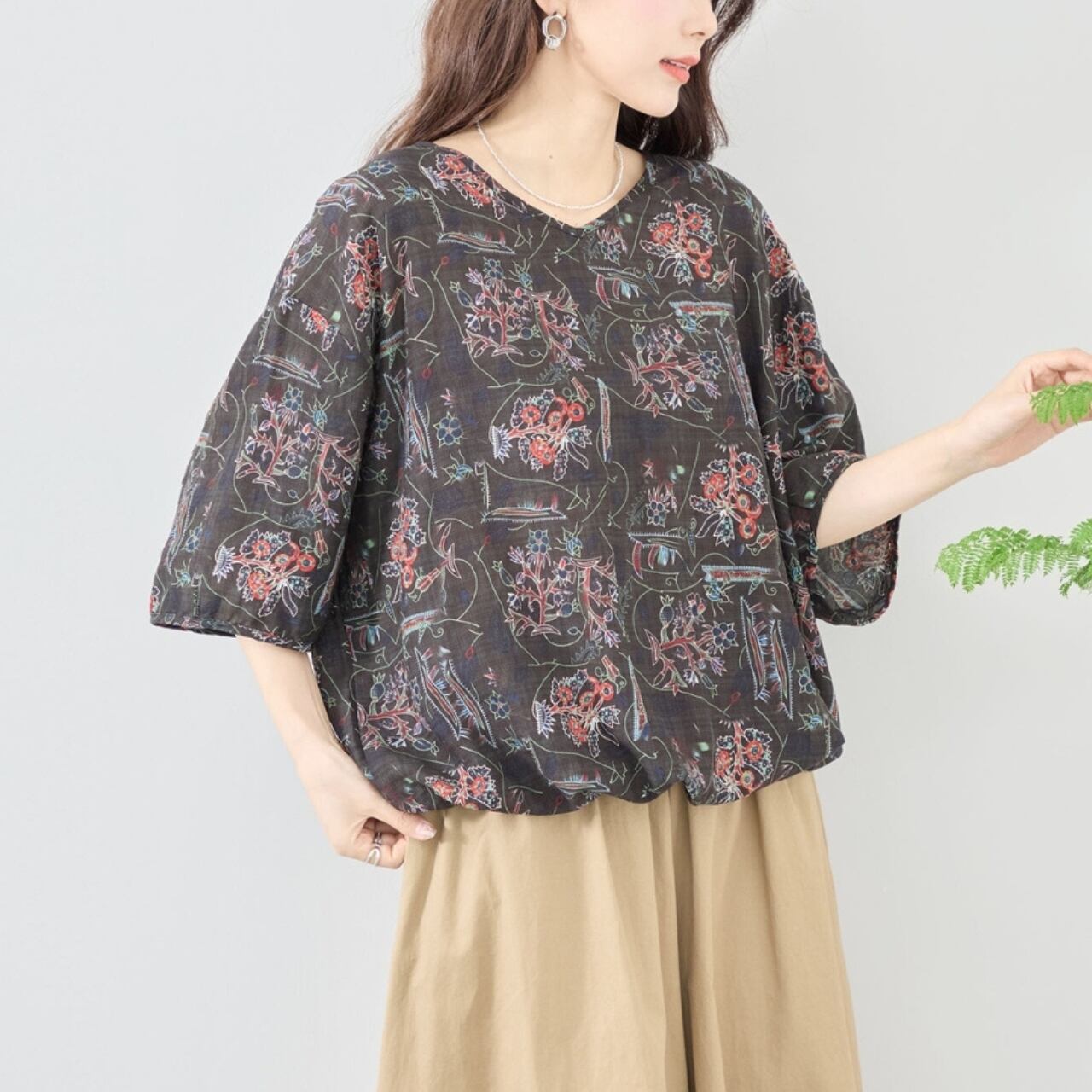 [TRUBE]コットン総柄プリントバルーンブラウス カットソー エスニック調 花柄 Vネック 五分袖 大人カジュアル ブラック