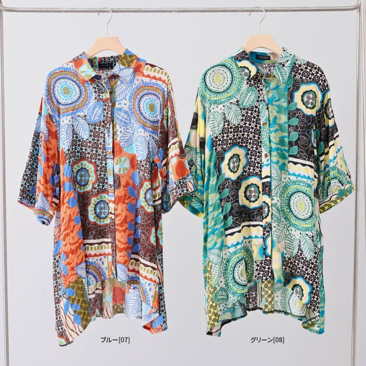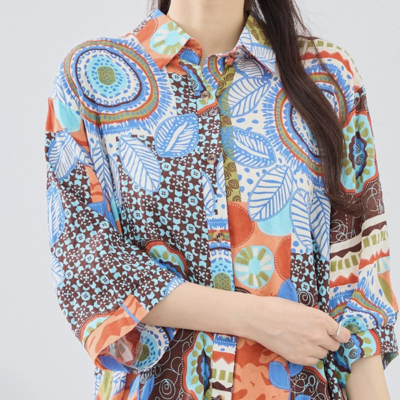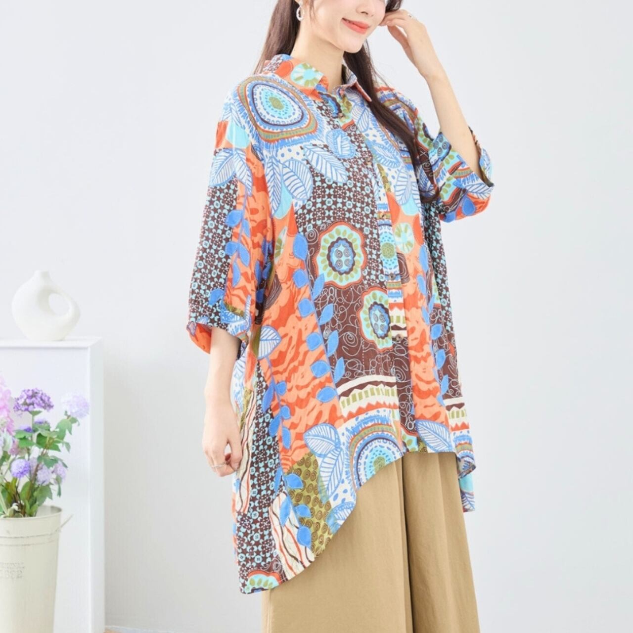 [TRUBE]エスニック柄ワイドシルエットシャツ ブラウス 七分袖 襟つき ボタン 大人カジュアル ゆったりサイズ コットン 全2色