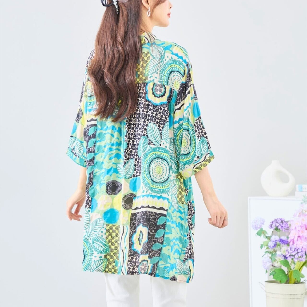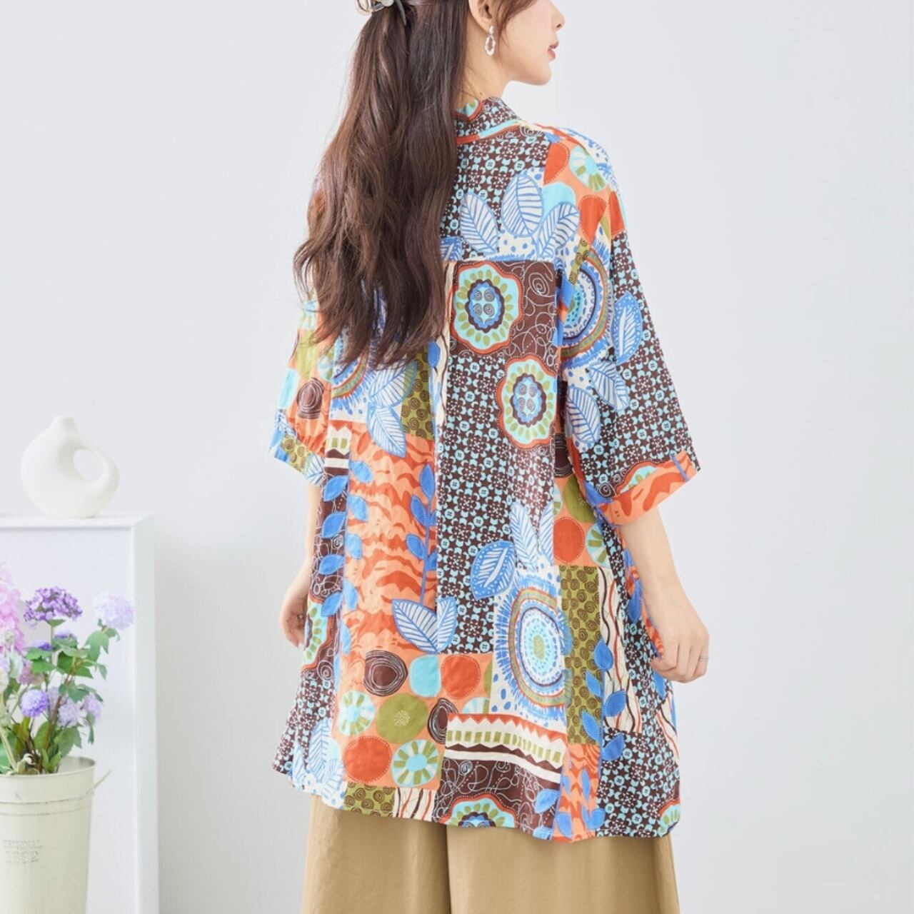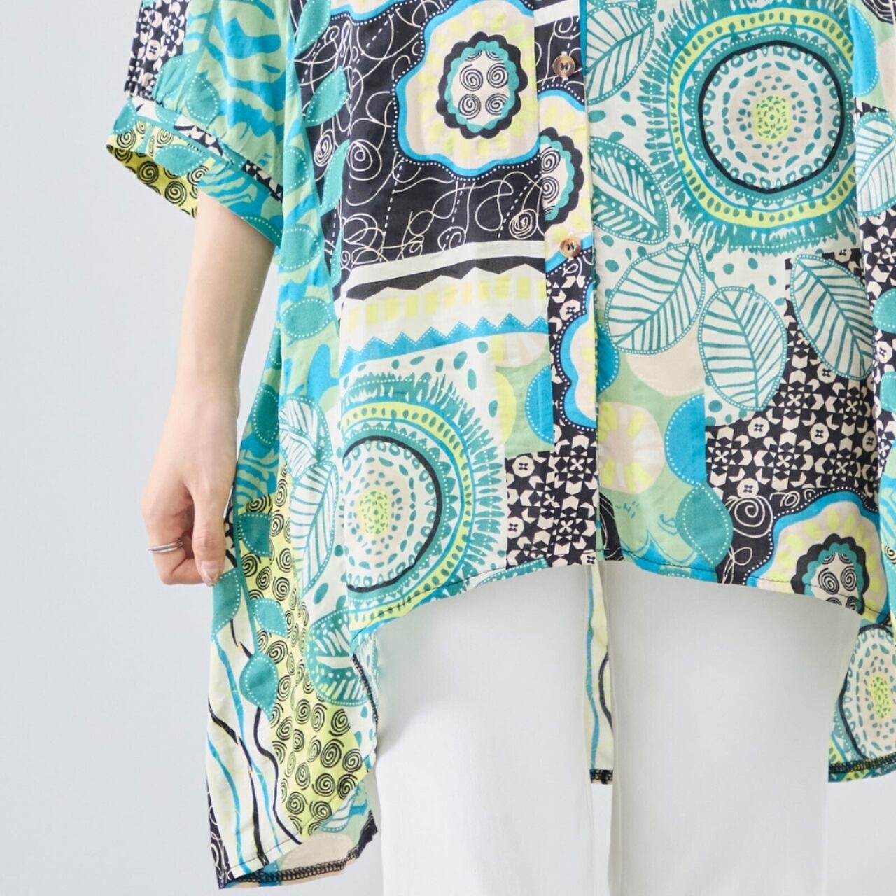 [TRUBE]エスニック柄ワイドシルエットシャツ ブラウス 七分袖 襟つき ボタン 大人カジュアル ゆったりサイズ コットン 全2色