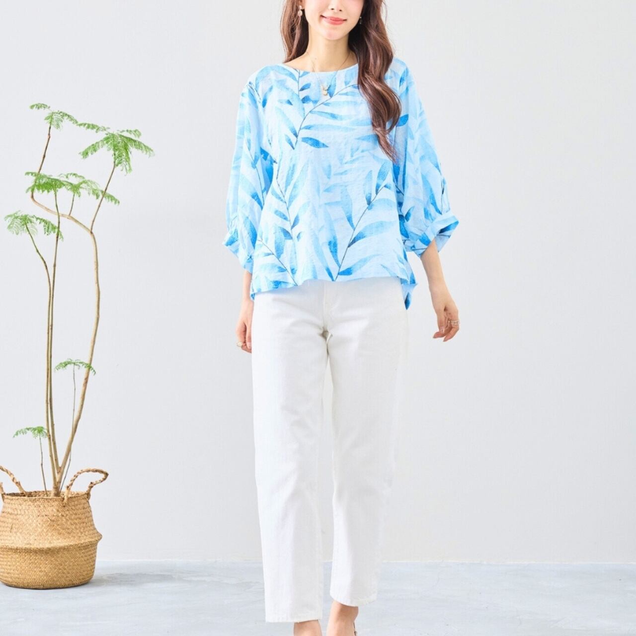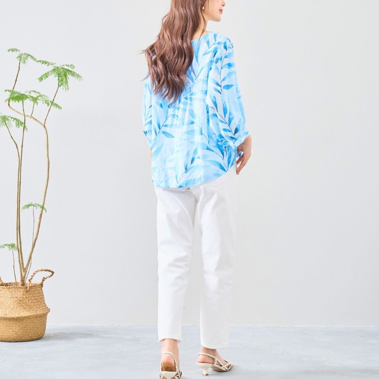 [TRUBE]ボタニカル柄バルーントップス カットソー ブラウス ゆったりサイズ 七分袖 大人カジュアル リゾート ブルー ホワイト