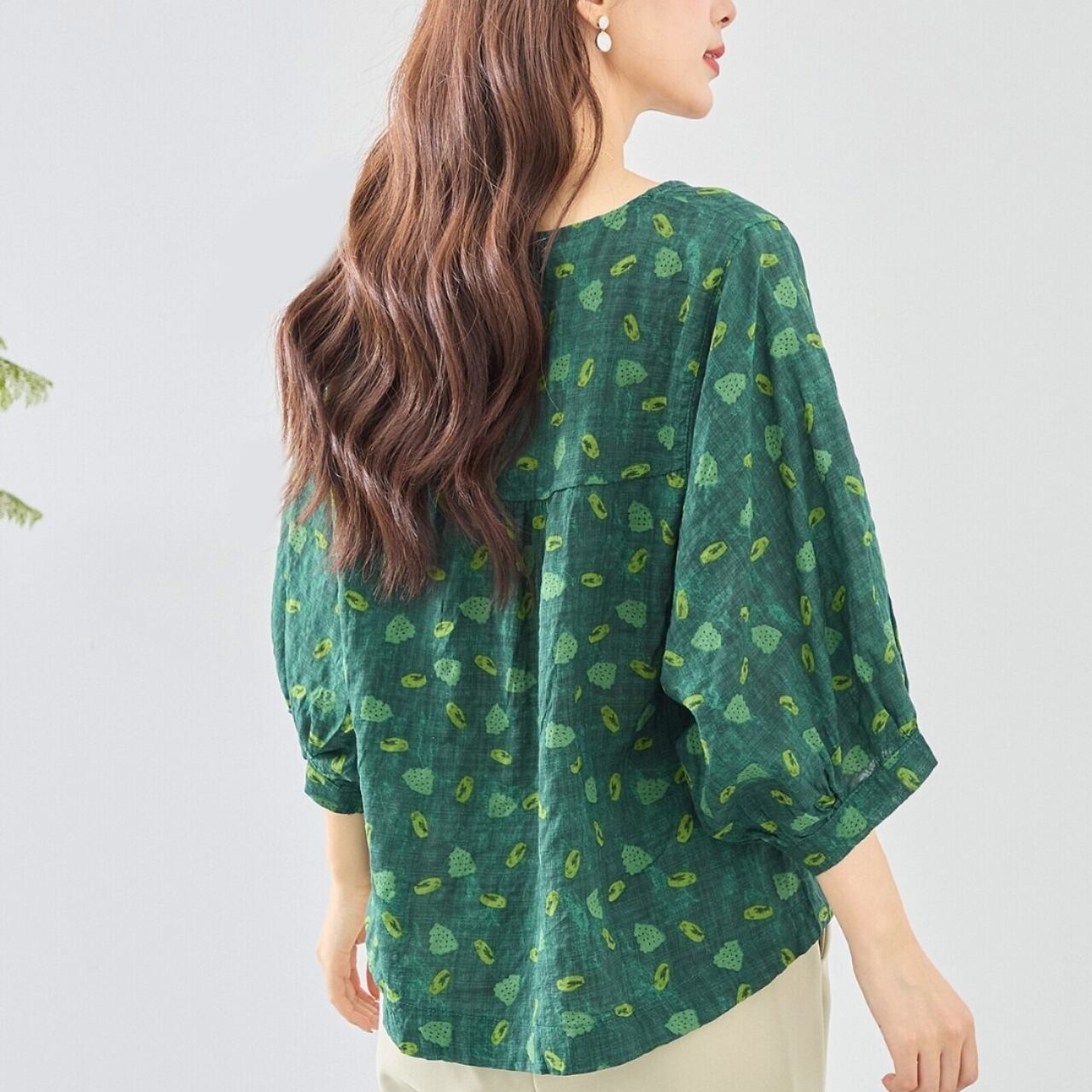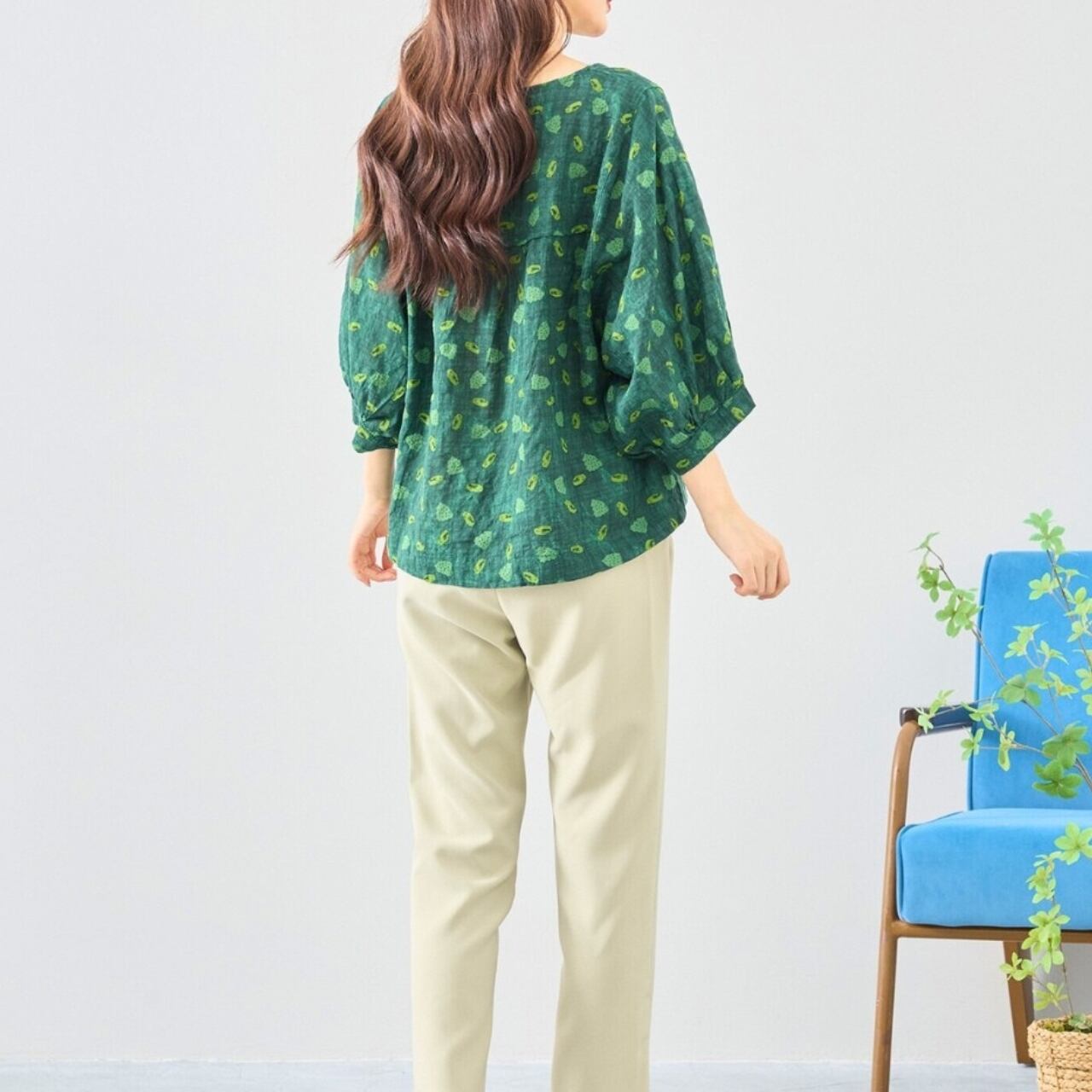 [2024新作][TRUBE]総柄バルーントップス 七分袖 カットソー ブラウス ボートネック ゆったりサイズ エスニック ブラウス ミセスファッション グリーン