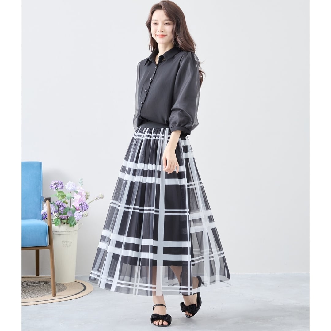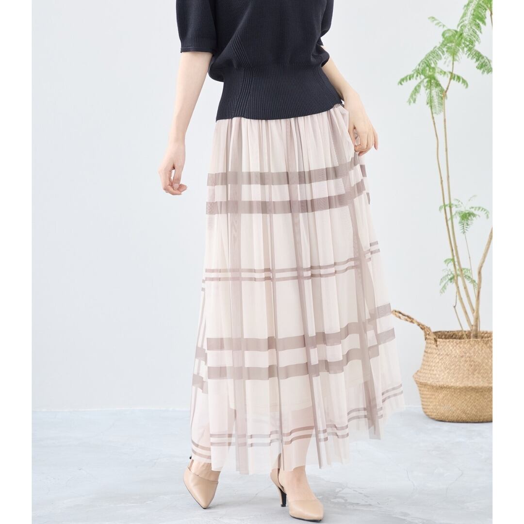 [2024新作][TRUBE]チェック柄チュールスカート ロングスカート フレアスカート モダン 大人がジュアル ブラック ベージュ