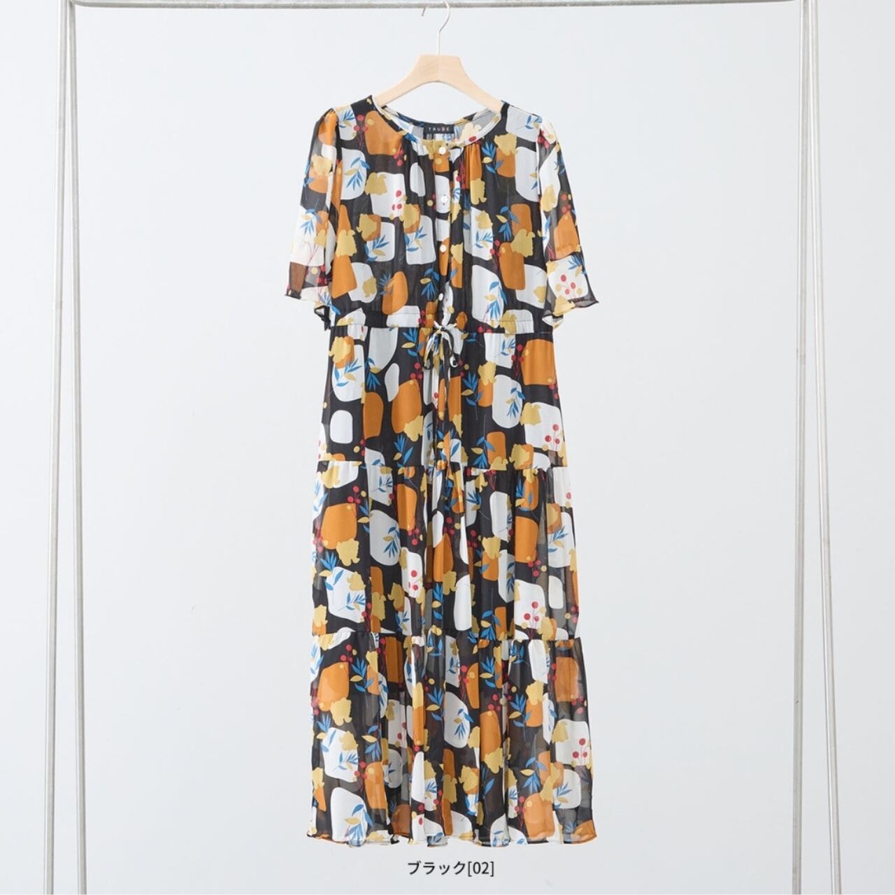 [TRUBE]ボタニカル柄シフォンワンピース ロング丈 半袖 リゾートファッション カジュアル ブラック