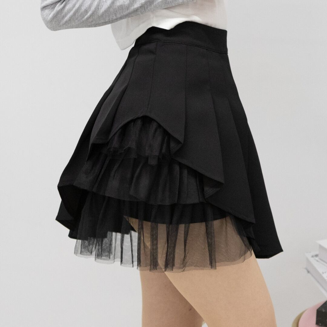 [2024新作][PUMPKIN PORT]プリーツミニスカート サイドチュールフリル インパン付 韓国ファッション 10代 20代 制服風 ブラック グレー