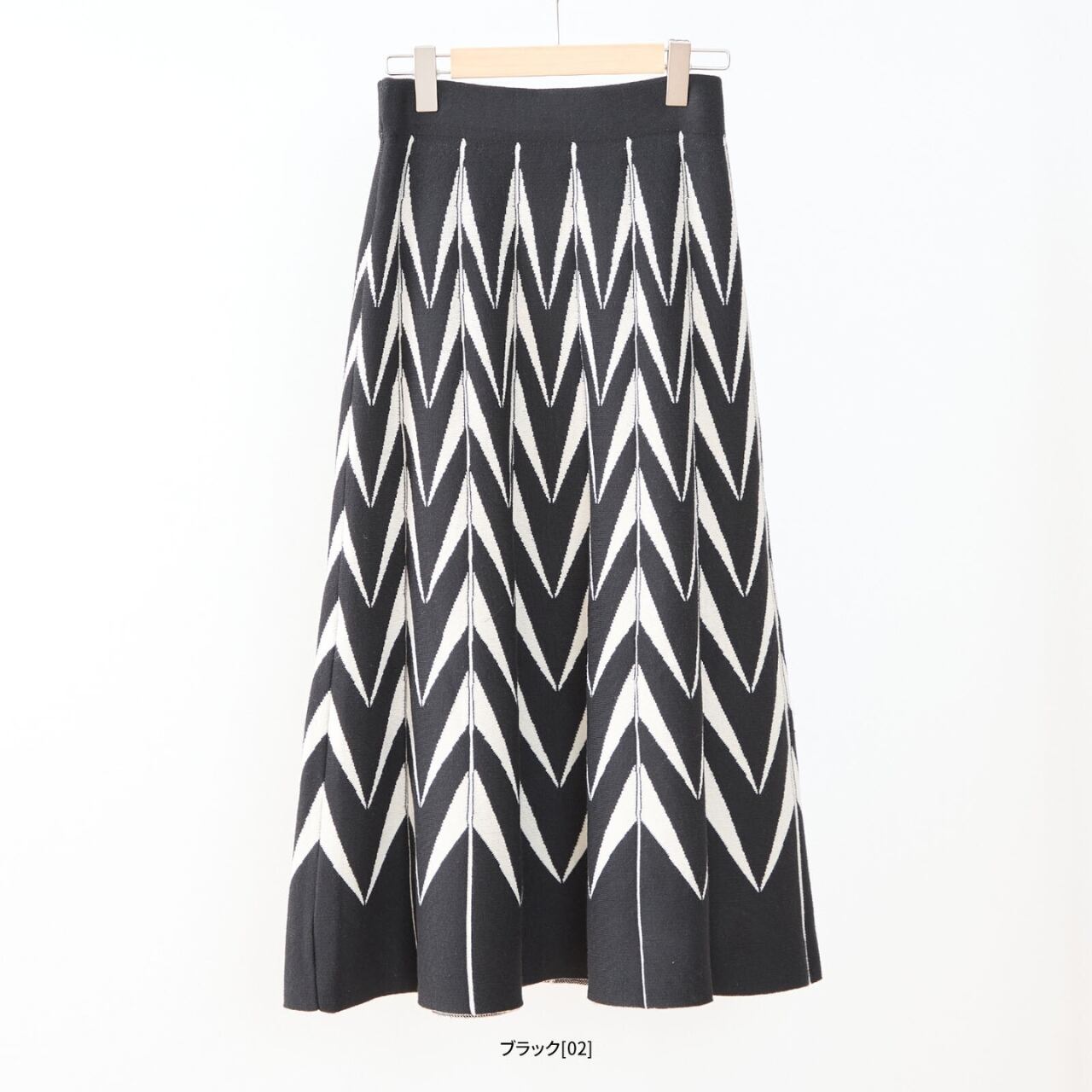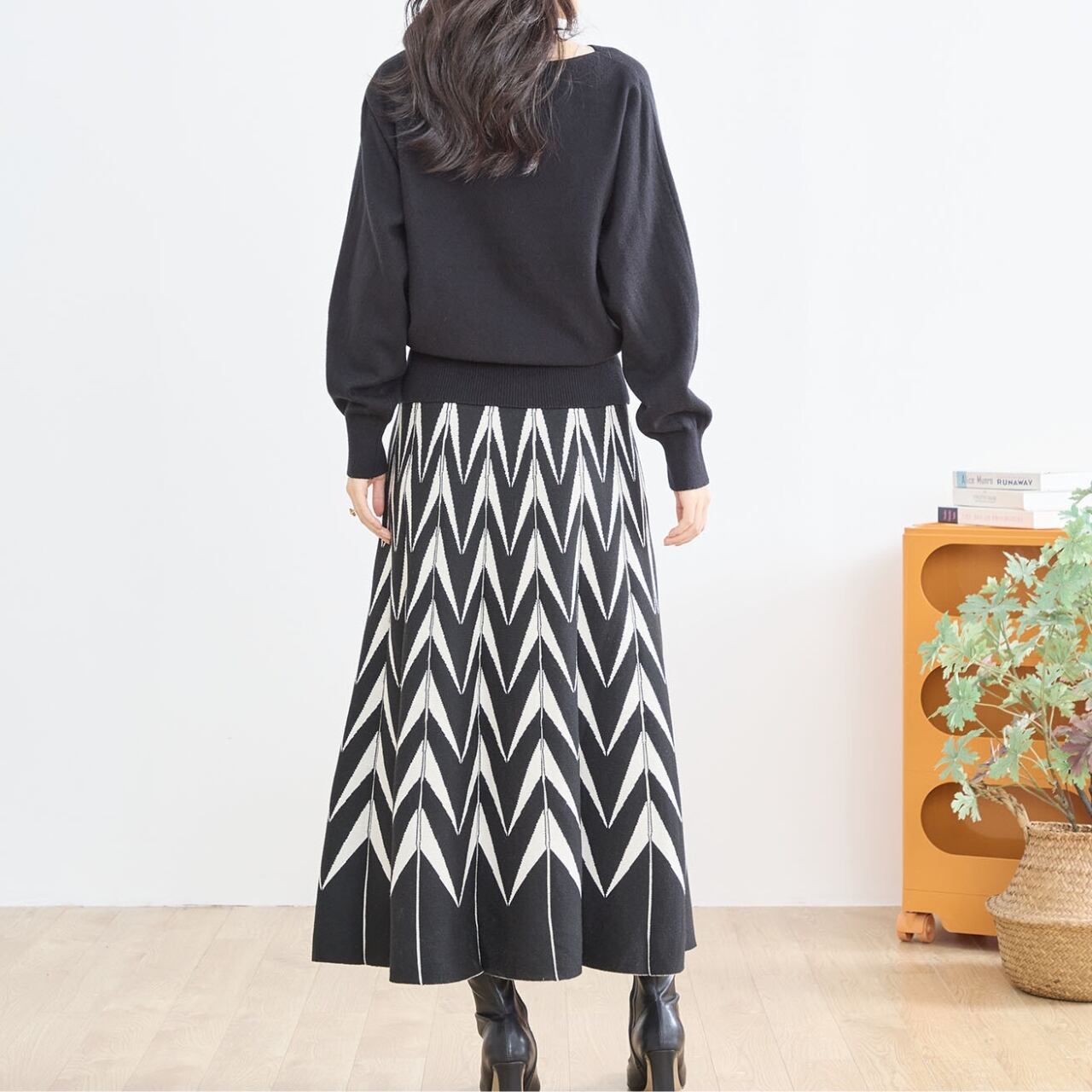 [新作][TRUBE]ジオメトリックパターンニットスカート ロングスカート リブ編み フレア レトロ 大人カジュアル ミセスファッション ブラック ホワイト