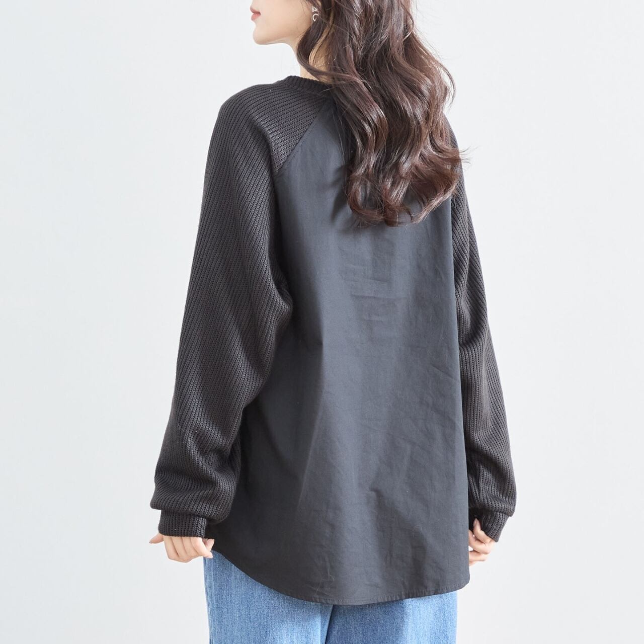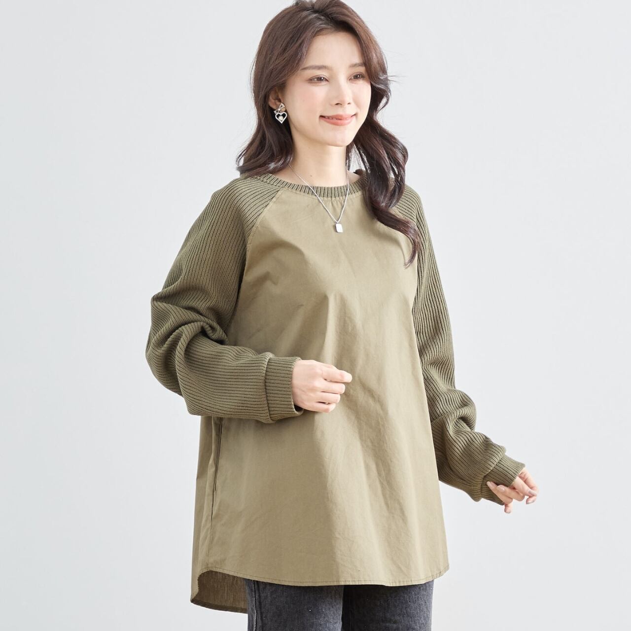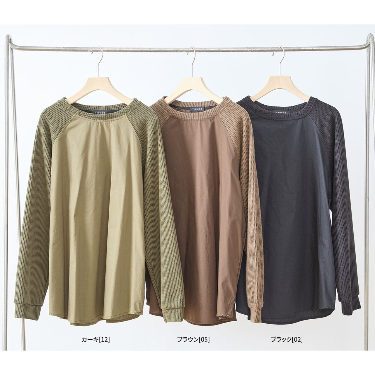 [秋冬新作][TRUBE]異素材切替リラックストップス ニット ラグラン トレーナー カットソー 長袖 ゆったりサイズ 大人カジュアル ミセスファッション ブラック カーキ ブラウン