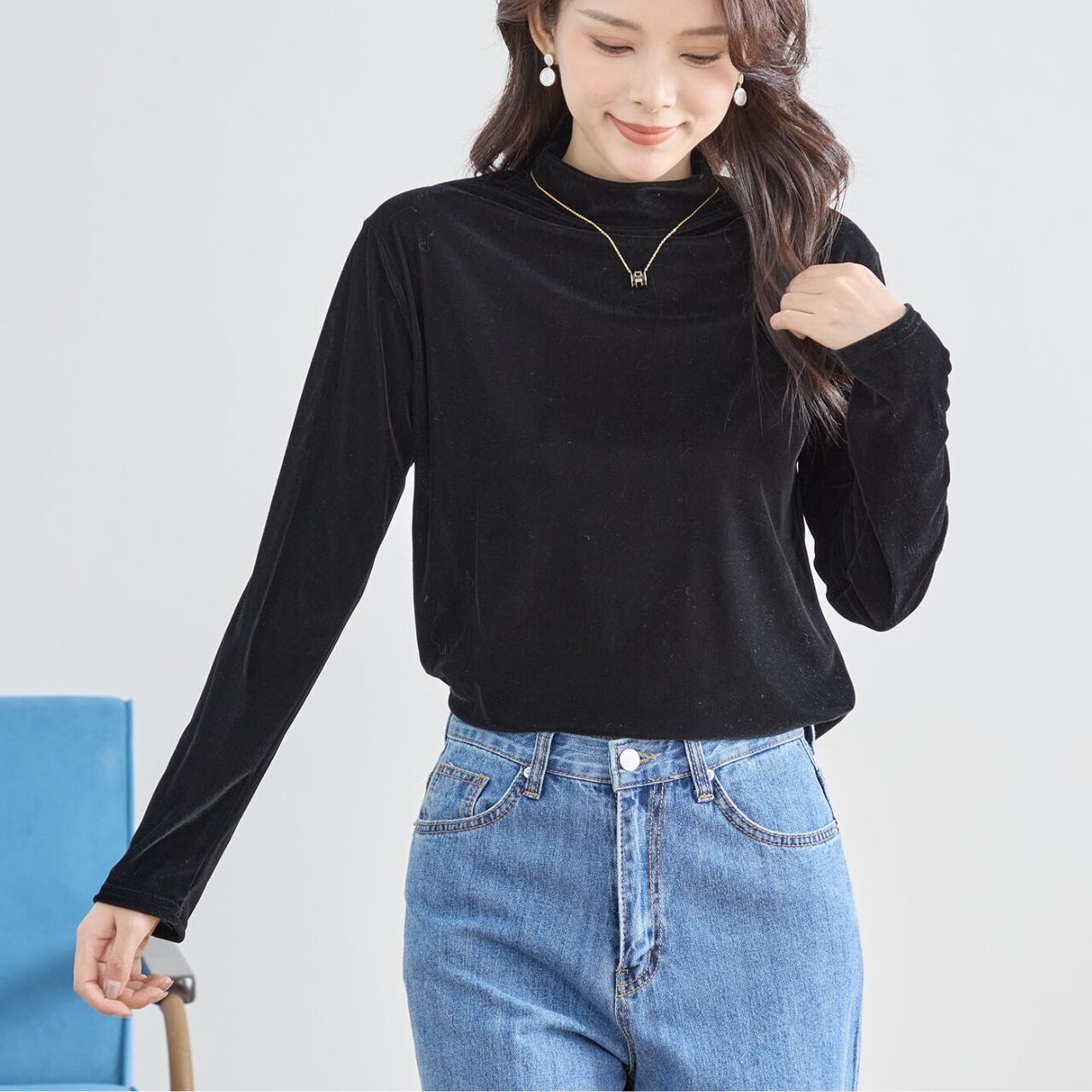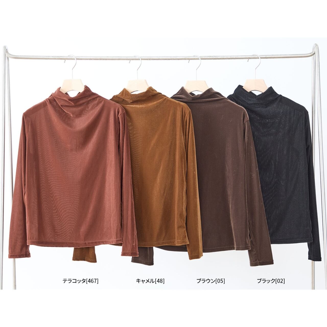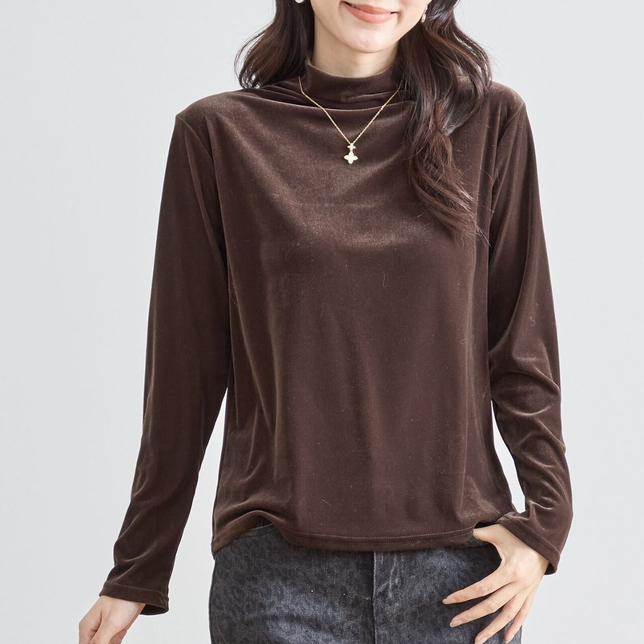 [amie studio]ベロア風ハイネックカットソー 長袖 光沢感 大人カジュアル ミセスファッション ブラック ブラウン