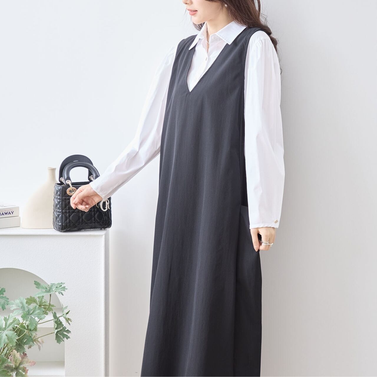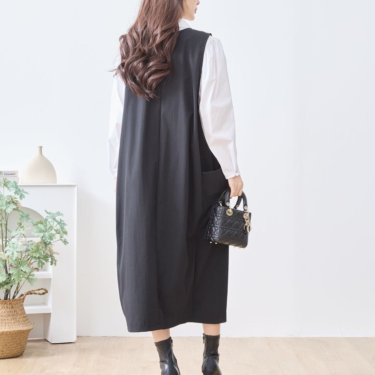 [新作][TRUBE]Vネックポケット付ジャンパースカート ワンピース ゆったりサイズ 無地 Iライン 大人カジュアル ミセスファッション ブラック