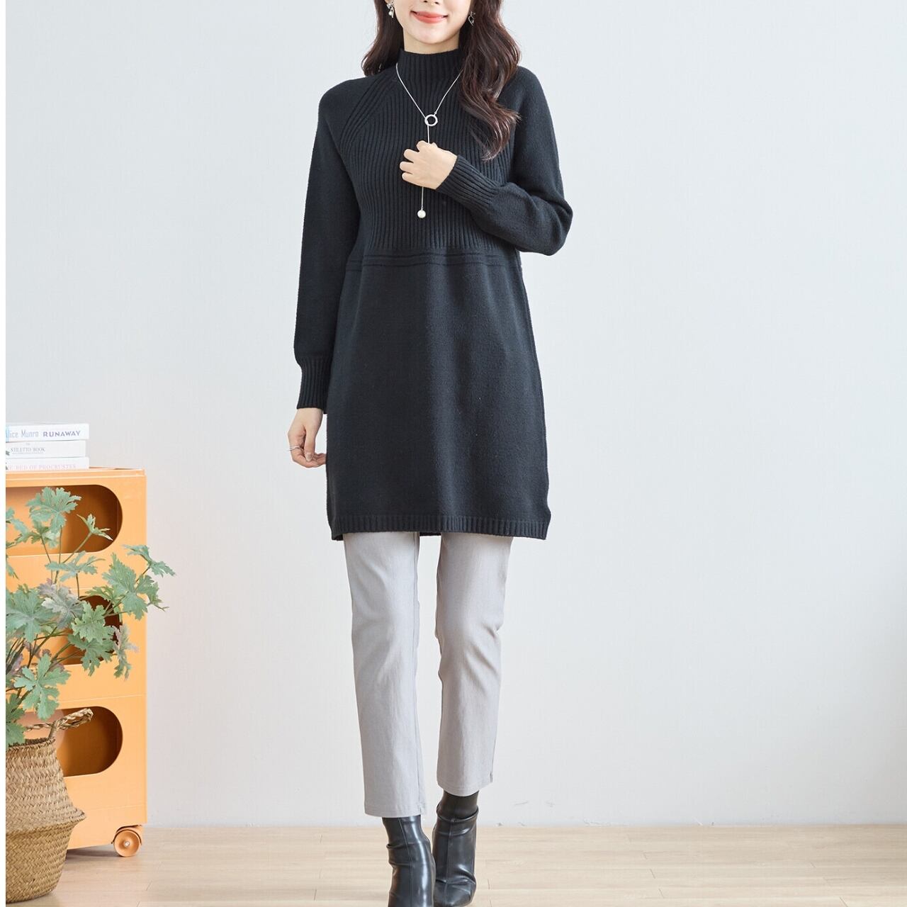 [新作][TRUBE]モックネックニットチュニック ニットワンピース ゆったりシルエット リブ切り替え 長袖 ブラック グレー ピンク