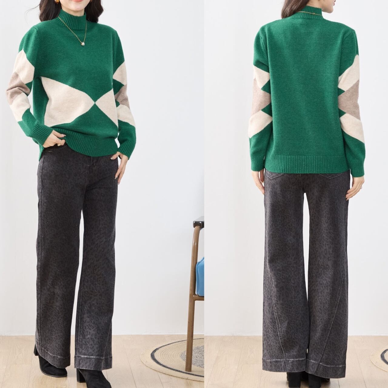 [reve bleu][秋冬]ダイヤパターンハイネックニット セーター 大人カジュアル ミセスファッション ブラック レッド