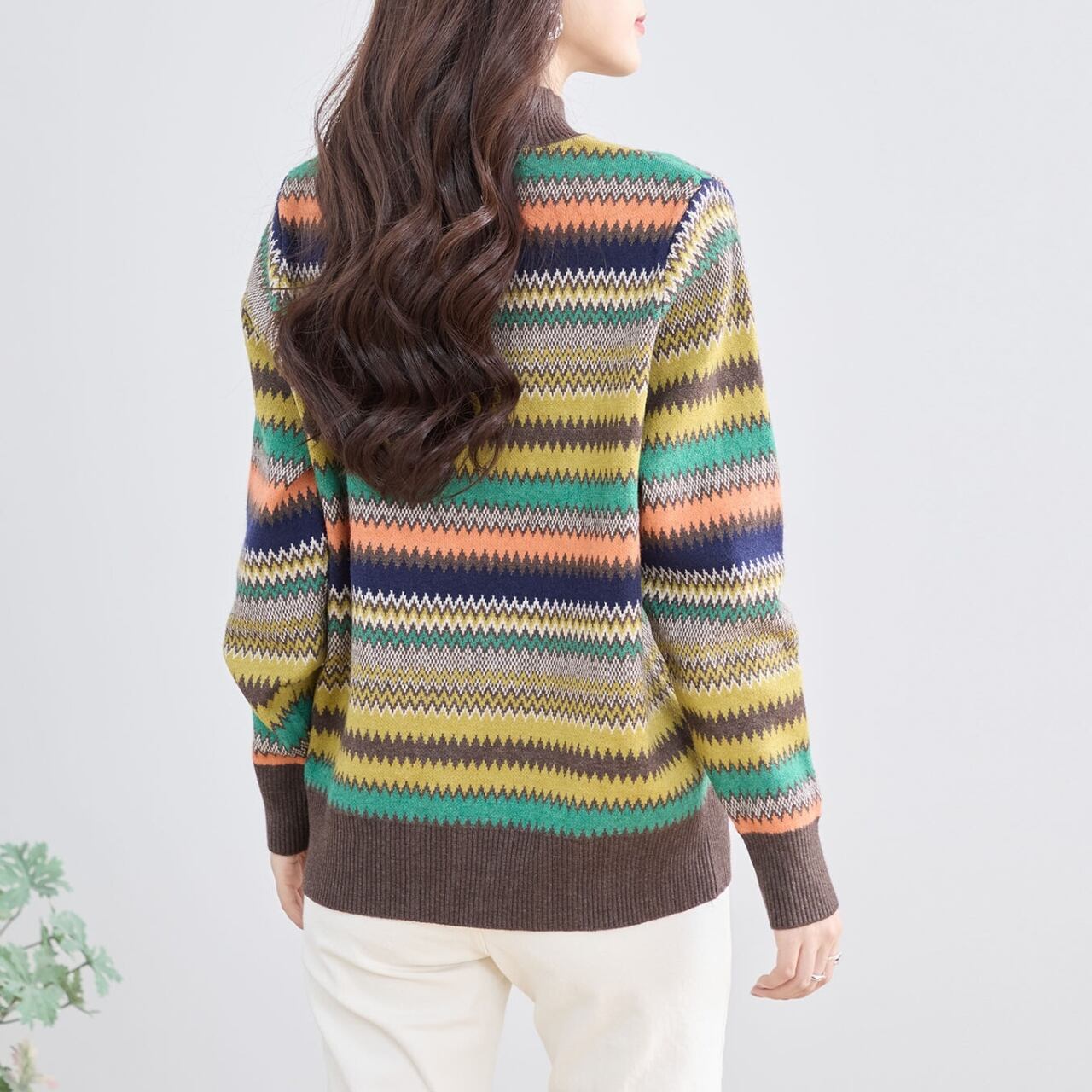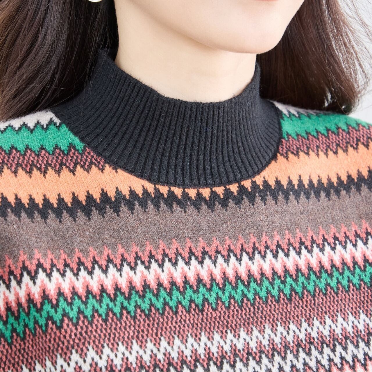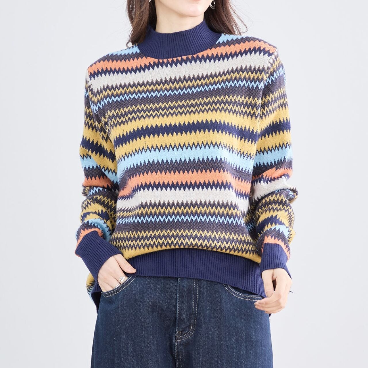 [新作][TRUBE]マルチボーダーハイネックニット セーター 幾何学模様 エスニック 長袖 リブ カラフル マルチカラー 大人カジュアル ミセスファッション ブラック ベージュ ブラウン ネイビー