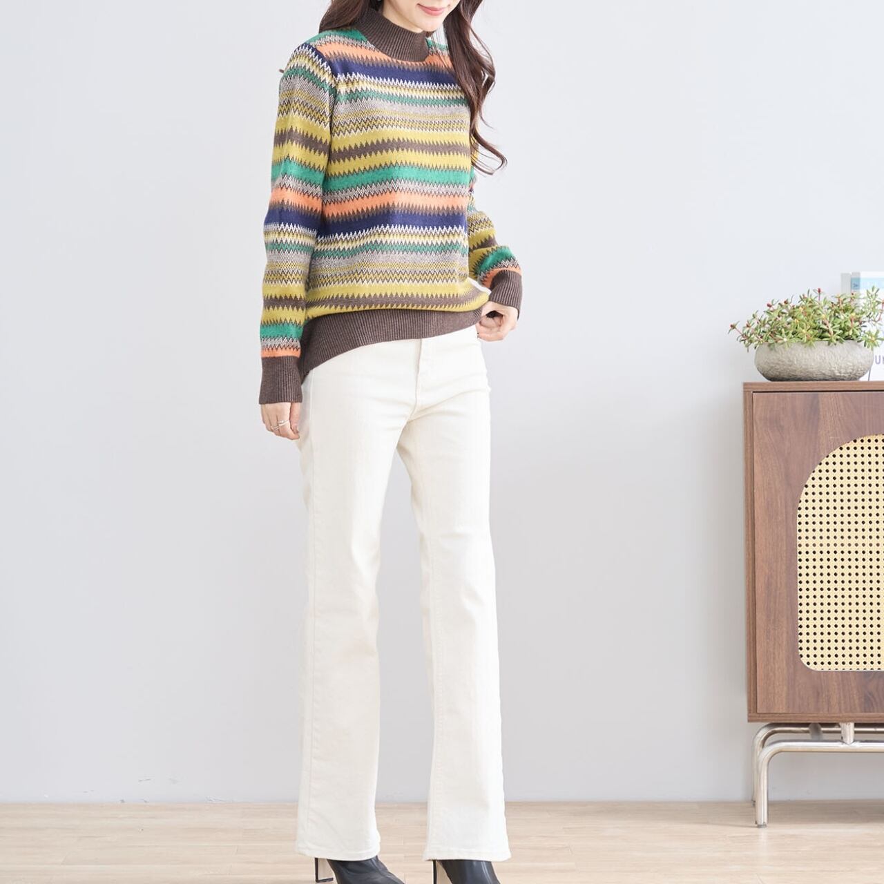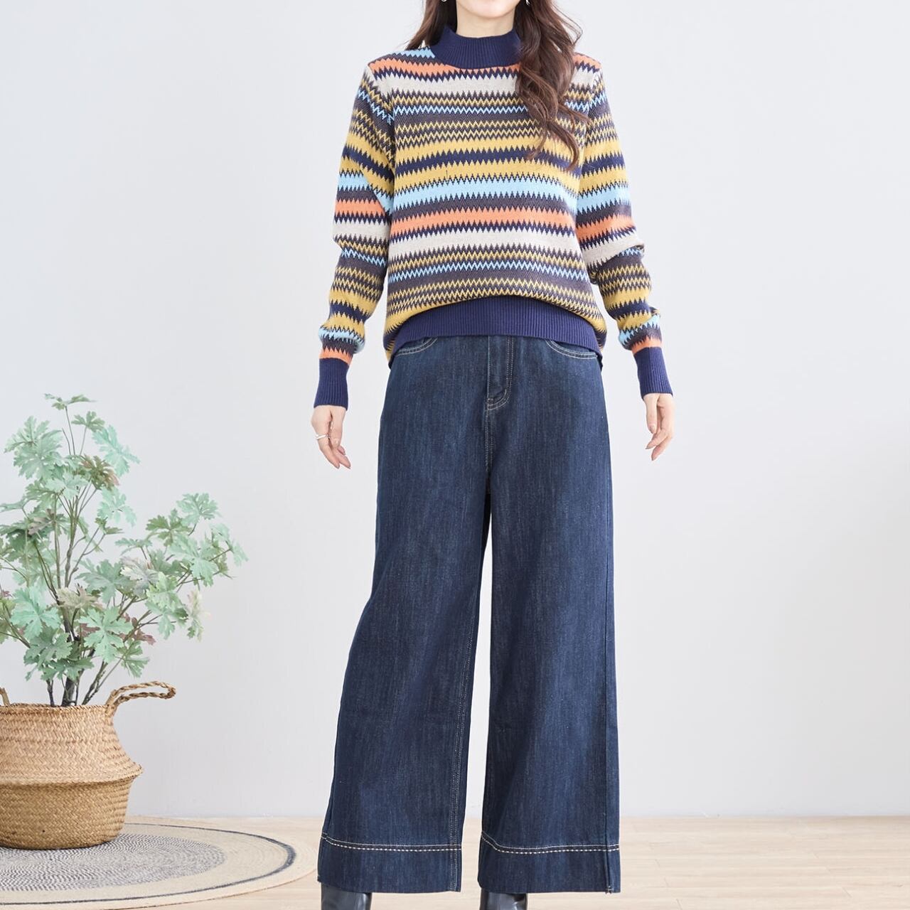 カラフルなボーダーが目をひくニット
