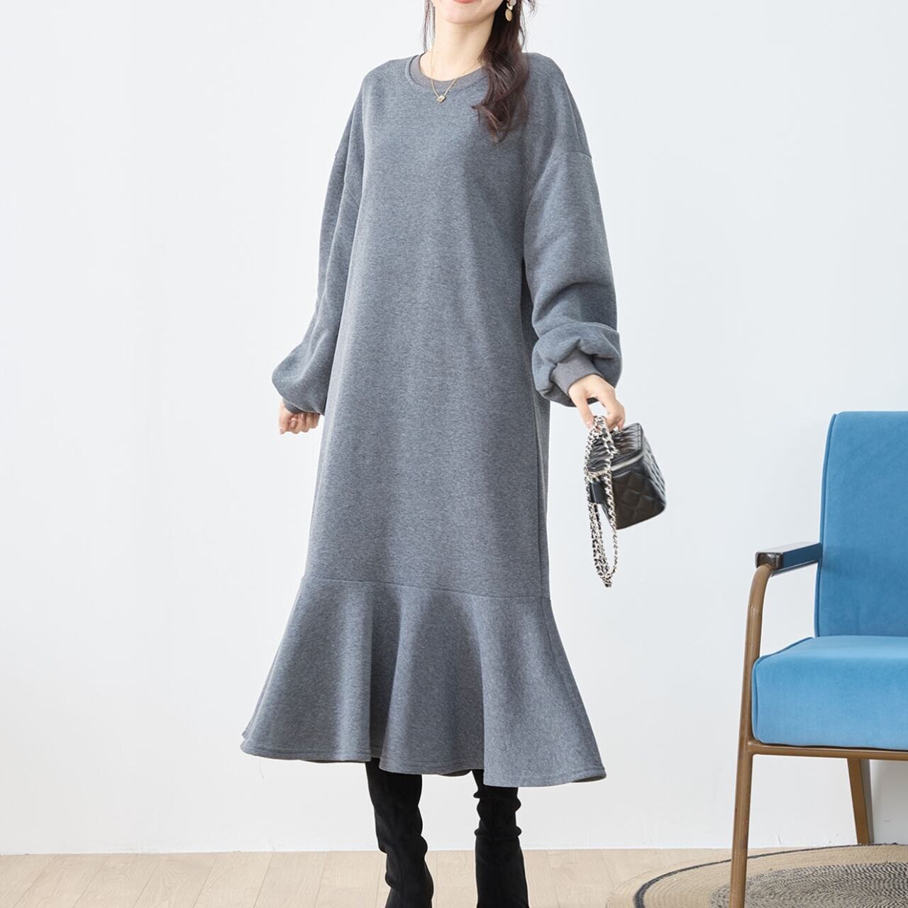 [新作][TRUBE]裾フリルスウェットワンピース ロングワンピース カットソーワンピース バルーン ゆったりサイズ ラウンドネック 大人カジュアル ミセスファッション ブラック グレー