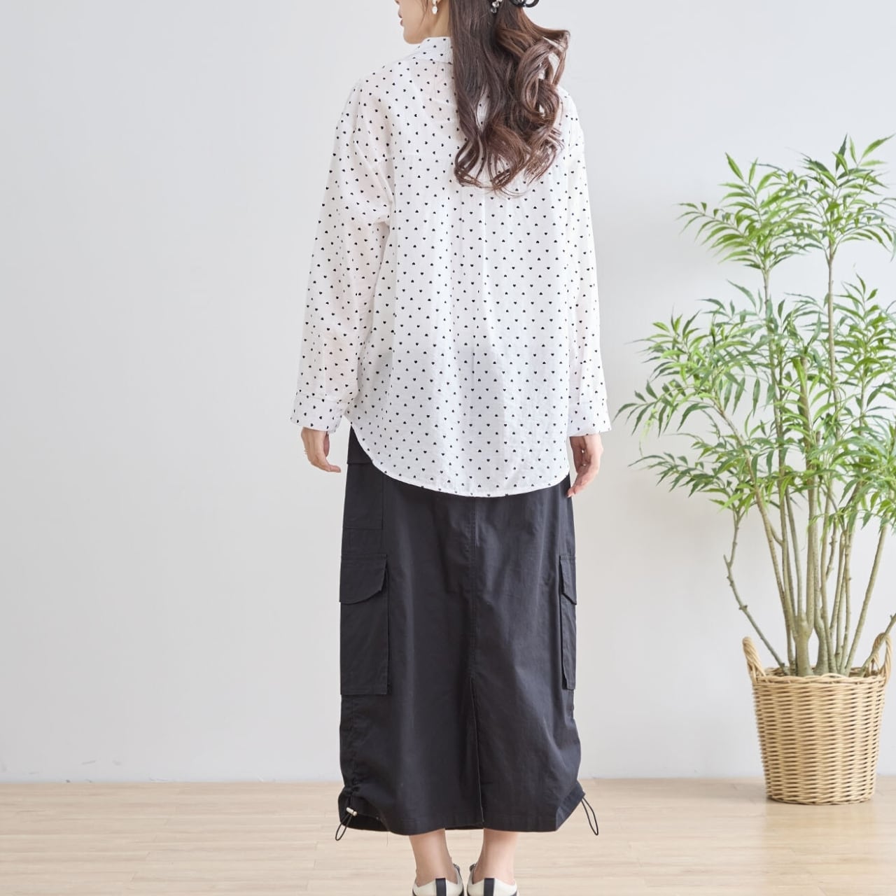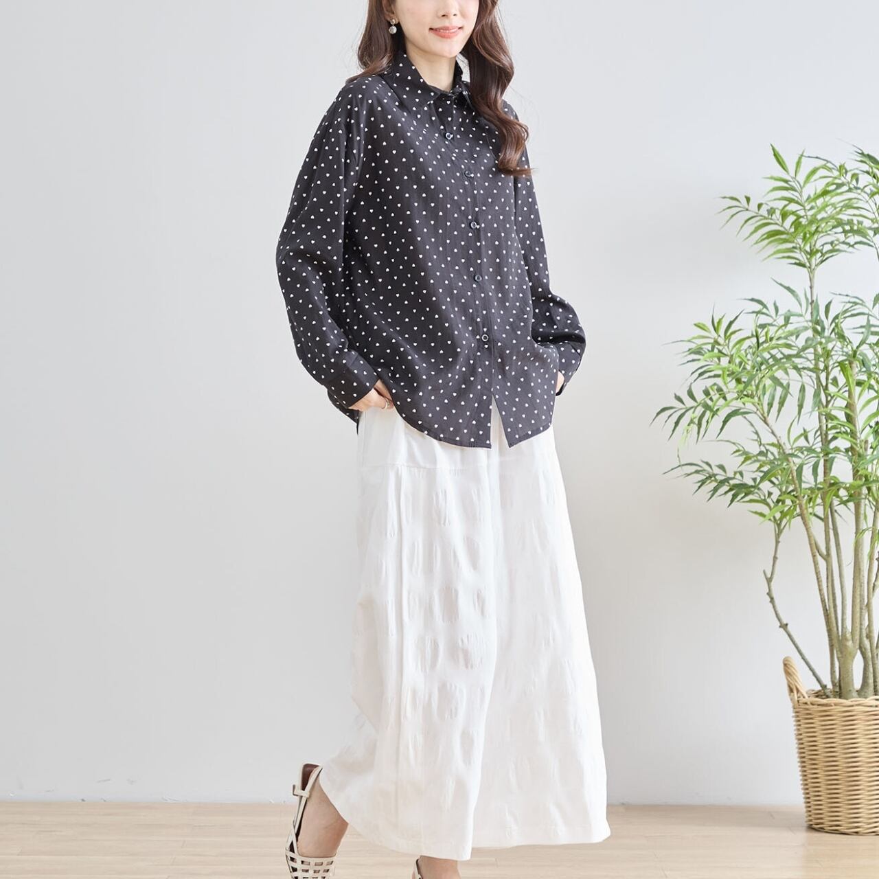 [新作][TRUBE]ハートドット長袖シャツ ボタンシャツ ハート柄 透け感 大人かわいい ミセスファッション ブラック 黒 ホワイト 白 M L